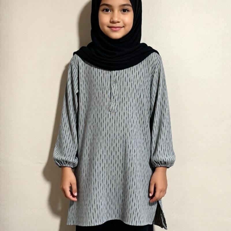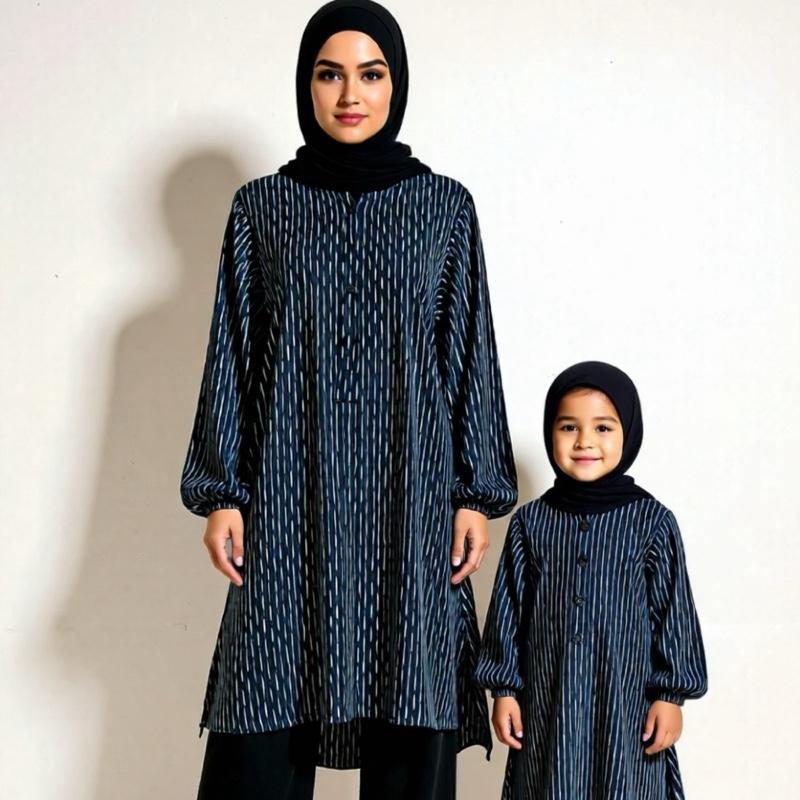 ✨ Stylish Blue Striped Mother & Child Outfit for coordinated looks. This matching hijab set is perfect for mom and daughter. The adult size 1 fits S-XL, with Ptp 60cm, hips 65cm, length 98cm, and sleeves 60cm. The kids sizes range from 1-2 years to 11-12 years, with various measurements.